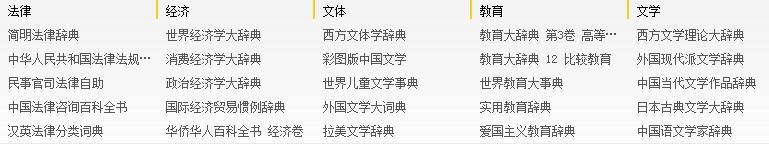 主要收錄國內各大出版社各個領域的權威工具書,目前已經收錄了《中國大百科全書》、《漢語大詞典》、《辭海》等權威工具書;